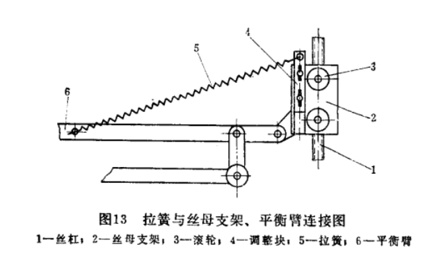 在保證拉簧質(zhì)量的情況下,為使平衡吊在空載時(shí)得到更好的平衡效果,應(yīng)在絲母支架的上端裝一個(gè)可上下調(diào)整的調(diào)整塊,以調(diào)節(jié)彈簧的拉力。