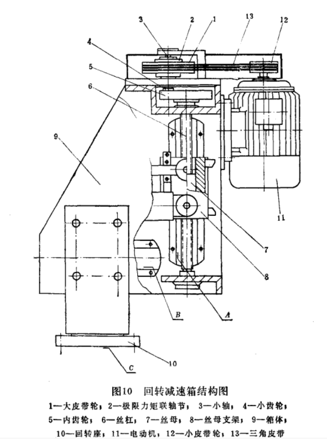 回轉(zhuǎn)減速箱由大皮帶輪1、力矩聯(lián)軸節(jié)2、小軸3、小齒輪4、內(nèi)齒輪5、絲杠6、絲母7、絲母支架8、箱體9以及回轉(zhuǎn)座10等零件組成。回轉(zhuǎn)減速箱與電動機(jī)11、電源控制箱及平衡臂相連接,其結(jié)構(gòu)如圖10所示。