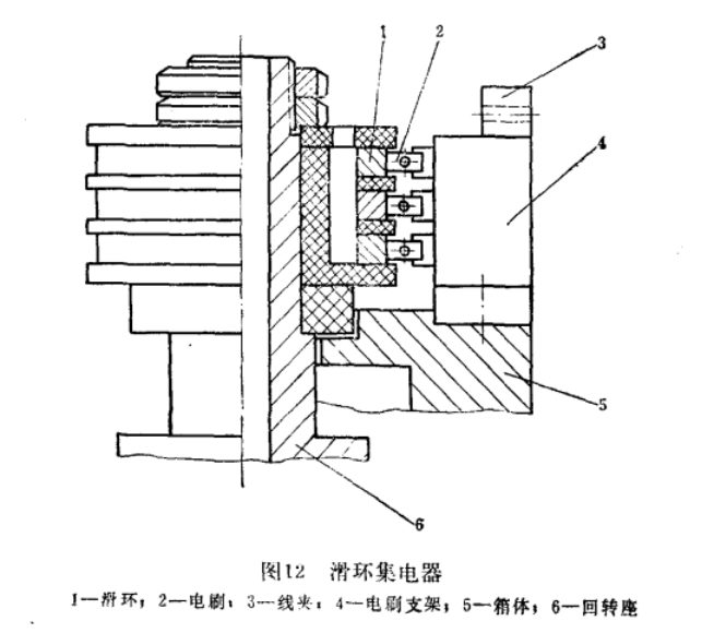 滑環(huán)集電器的滑環(huán)1固定在不旋轉(zhuǎn)的回轉(zhuǎn)座6上,電源導(dǎo)線從立柱的底部引入,通過回轉(zhuǎn)座的中心孔接在滑環(huán)上。